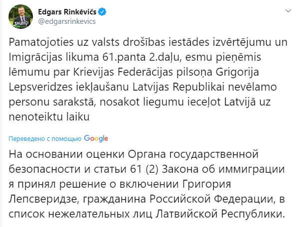 "На основании оценки органов государственной безопасности и закона "Об иммиграции я принял решение о включении Григория Лепсверидзе, гражданина Российской Федерации, в список нежелательных лиц Латвийской Республики", - написал Ринкевич.