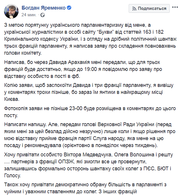 "С целью спасения украинского парламентаризма от меня, а украинской журналистики в лице сайта "Буквы" от статьи 163 и 182 Уголовного кодекса Украины, и учитывая мелкий политический шантаж трех фракций парламента, я написал заявление о сложении полномочий председателя комитета", - объяснил свой поступок нардеп.
