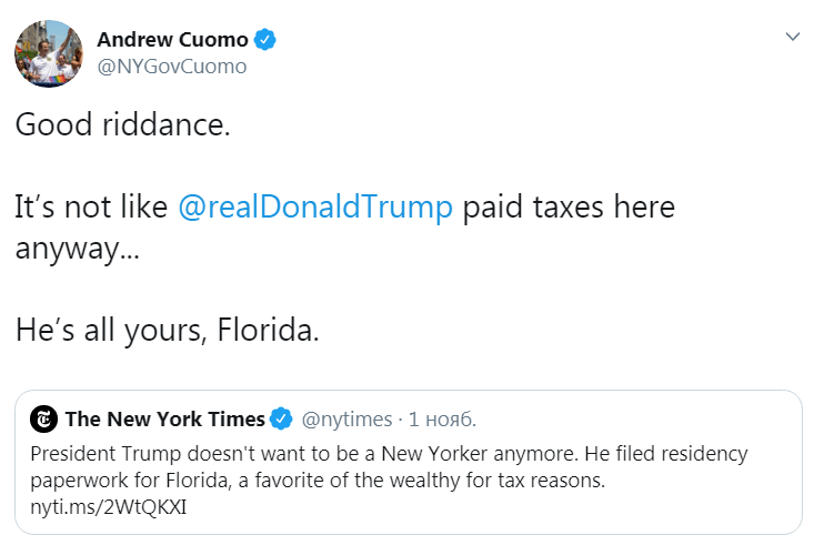 Президент конфликтует с влиятельными демократами: губернатором штата Нью-Йорк Эндрю Куомо и мэром Нью-Йорка Биллом де Блазио. Оба приветствовали известие о переезде Трампа во Флориду. А Куомо оспорил утверждение американского лидера о том, что тот платит налоги. Он привел цитату The New York Times, в которой утверждается, что Флориду Трамп выбрал потому, что для богатых там существуют налоговые льготы.