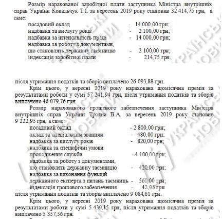 Согласно выписке Департамента коммуникаций МВД Украины, зарплата Сергея Ярового, первого зама Авакова, составила 83911 грн, заместителей Сергея Гончарова – 89655 грн, Татьяны Ковальчук – 89655 грн, Вадима Трояна – 14661 грн, государственного секретаря Алексея Тахтая – 68062 грн.