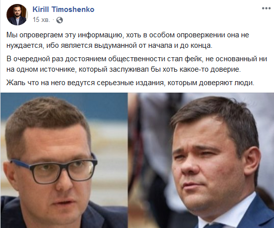 В очередной раз достоянием общественности стал фейк, не основанный ни на одном источнике, который заслуживал бы хоть какое-то доверие. Жаль что на него ведутся серьезные издания, которым доверяют люди", - написал Кирилл Тимошенко.