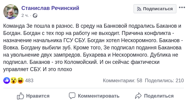 "Команда Зе пошла в разнос. В среду на Банковой подрались Баканов и Богдан. Богдан с тех пор на работу не выходит. Причина конфликта - назначение начальника ГСУ СБУ. Богдан хотел Нескоромного. Баканов - Вовка. Богдану выбили зуб. Кроме того, Зе подписал подання Баканова на увольнение двух зампредов. Бухарева и Нескоромного. Дублика не подписал. Баканов - это Коломойский. И он сейчас фактически управляет СБУ. И это плохо", - написал Речинский.