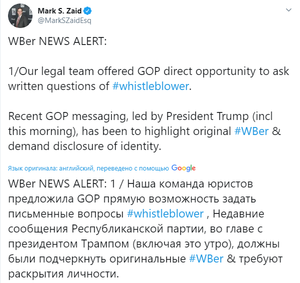 "Быть осведомителем - это не партийная работа, и импичмент не является целью. Это не наша роль. Поэтому мы предложили такую форму", - написал адвокат в Twitter.