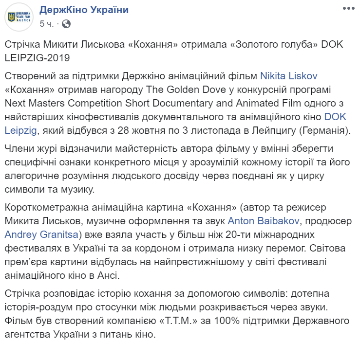 Украинский анимационный фильм Никиты Лыськова "Любовь" получил награду на одном из старейших кинофестивалей документального и анимационного кино Dok Leipzig-2019. Он проходил с 28 октября по 3 ноября в Лейпциге (Германия).