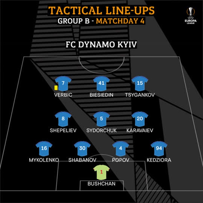 Динамо: Бущан - защитники - Кендзера, Попов, Шабанов, Миколенко - полузащитники - Караваев, Сидорчук, Шепелев - атака  Цыганков, Беседин, Вербич.