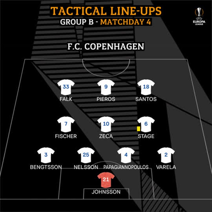 Копенгаген: Юнссон - защитники - Варела, Папаяннопулос, Нельссон, Бенгтссон - полузащитники - Стаге, Зека, Фишер - атака - Сантос, Сотириу, Фальк.