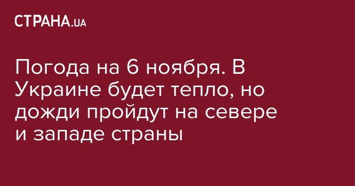 В среду, 6 ноября, в Украине ожидаются дожди на западе и севере. На остальной территории будет сухая погода с осенним теплом. Об этом сообщает синоптик Наталья Диденко.