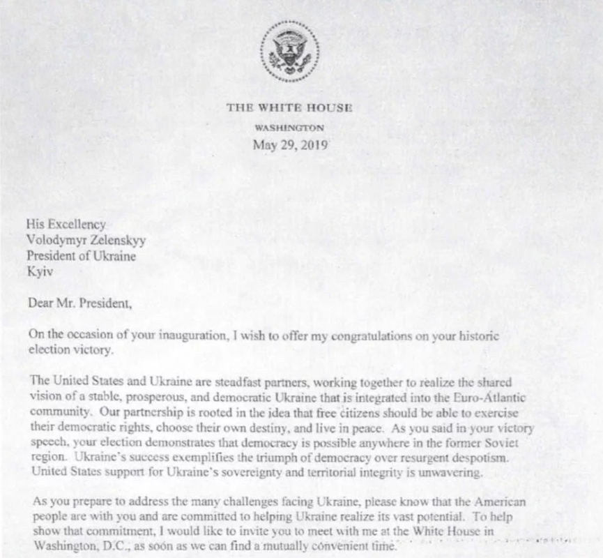 В Конгрессе США обнародовали письмо президента Дональда Трампа президенту Украины Владимиру Зеленскому от 29 мая 2019 года со словами поддержки и приглашением коллеге совершить визит в Белый дом.