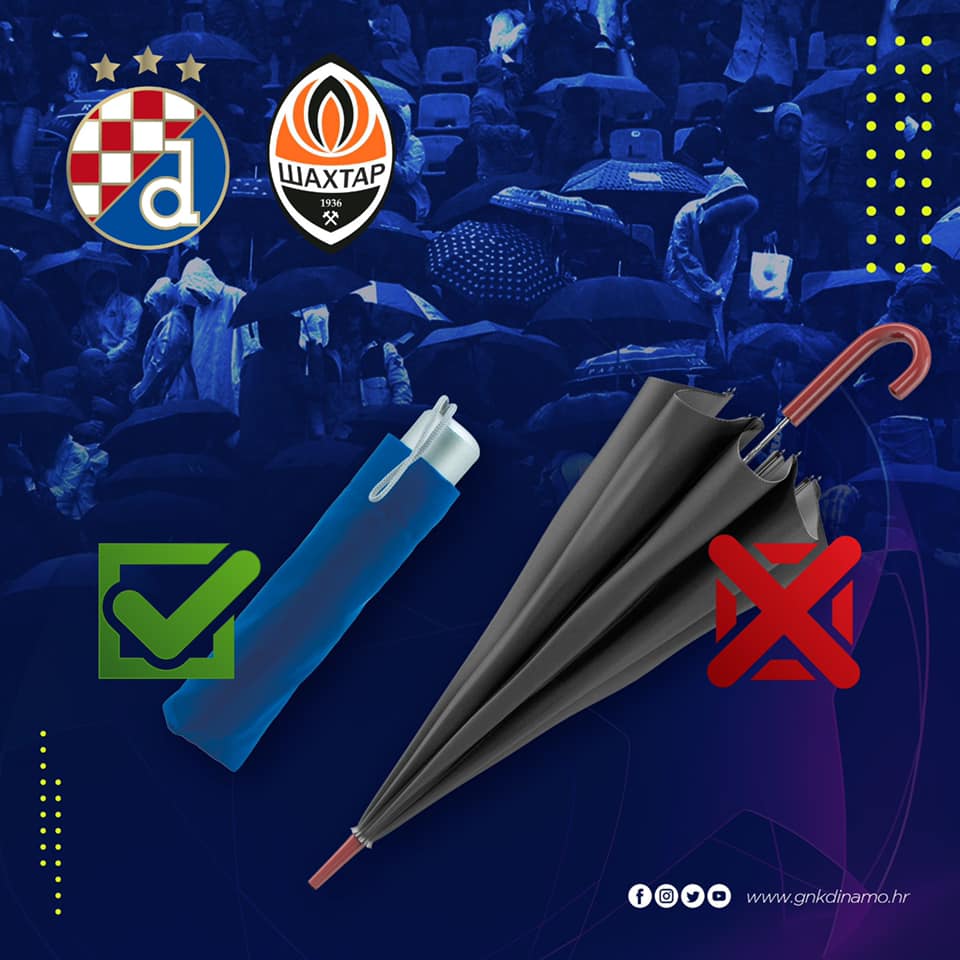 20:50 По прогнозам сегодня вечером в Загребе будет дождь. Болельщиков попросили взять дождевики или складные зонты и предупредили, что вход с зонтами в виде трости будет воспрещен в целях безопасности.