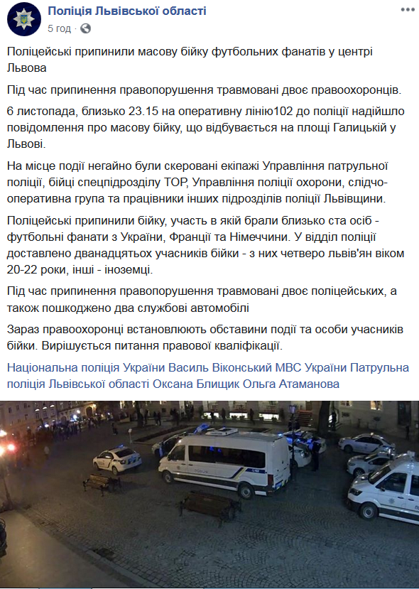 "6 ноября, около 23.15 на оперативную линию 102 в полицию поступило сообщение о массовой драке, что происходит на площади Галицкой во Львове.
