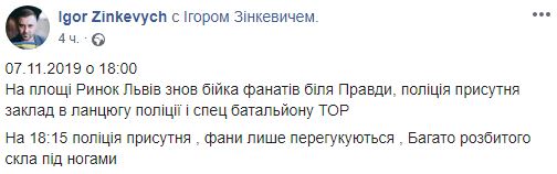 "На площади Рынок Львов снова драка фанатов возле "Правды". Полиция присутствует, заведение в цепи полиции и спецбатальона ТОР. На 18:15 полиция присутствует, фаны только перекликаются. Много разбитого стекла под ногами", – пишет Зинкевич.