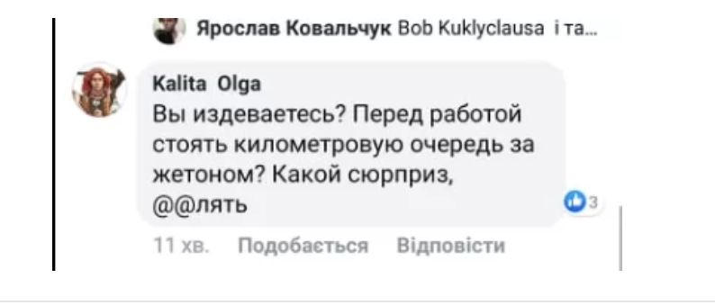 "Вы издеваетесь? Перед работой стоять километровую очередь за жетоном? Какой сюрприз, б**ть", - пишет Калита Ольга.