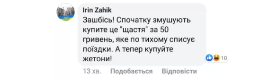 "Зашибись! Сначала заставляют купить это "счастье" за 50 грн, которое по тихому списывает поездки. А теперь покупайте жетоны!", - рассуждает Irin Zaxik.