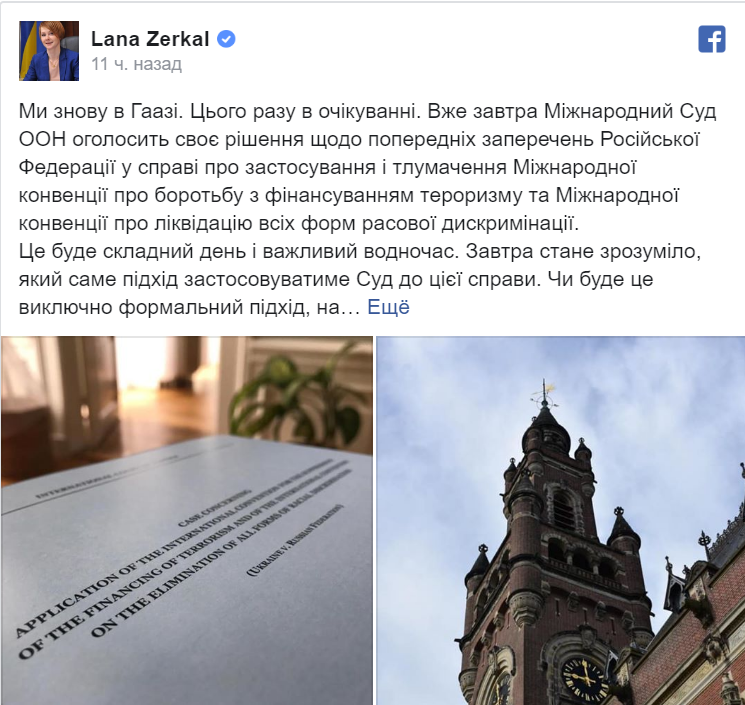 В пятницу, 8 ноября, в Международном суде ООН в нидерландской Гааге объявят важное решение по делу о применении и толковании Международной конвенции о борьбе с финансированием терроризма и Международной конвенции о ликвидации всех форм расовой дискриминации в ситуации с аннексированным Крымом. Об этом говорится на fb-странице заместителя главы МИД Елены Зеркаль.
