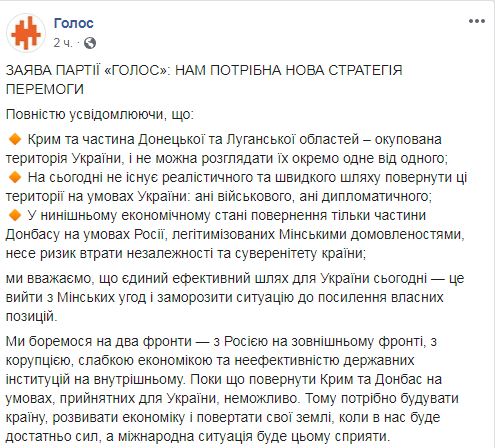 Партия "Голос" считает, что Украина должна выйти из Минского процесса по мирному урегулированию конфликта на Донбассе. Об этом говорится на Facebook-странице партии.