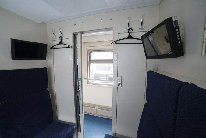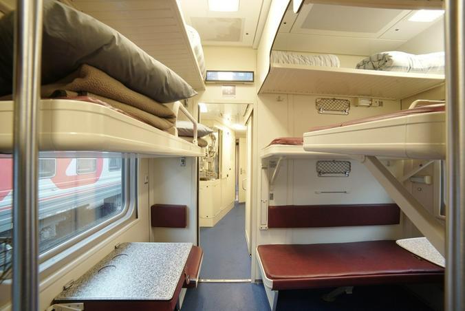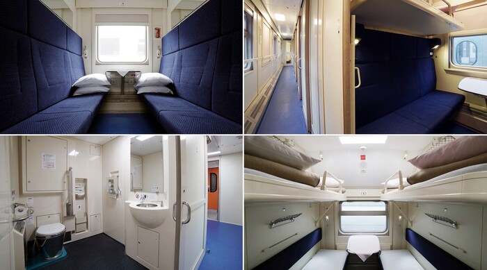 На фото СВ, купейные, штабные и плацкартные вагоны. В частности, спальные вагоны повышенной комфортности оборудованы душем и биотуалетами. В купе расположены два нижних дивана шириной 60 сантиметров каждый, с индивидуальным освещением.