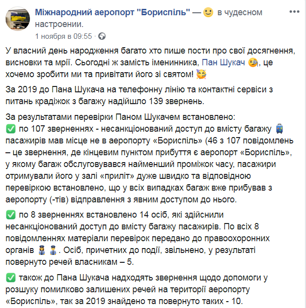 В 2019 году пассажиры Международного аэропорта "Борисполь" 139 раз обращались на горячую линию и в другие службы по поводу краж из багажа. Об этом пресс-служба аэропорта написала в Facebook.