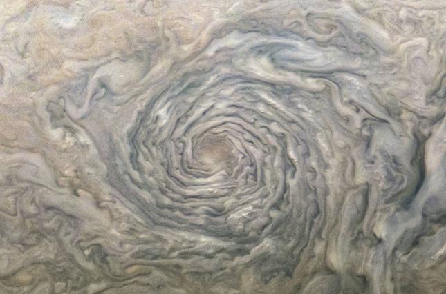 "Юнона" сфотографировала ураган 3 ноября во время 23 сближения с газовым гигантом. В момент снимка аппарат находился на высоте 8,5 тысяч километров от пика облаков Юпитера.