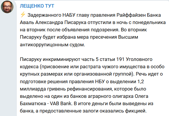 "Писаруку инкриминируют часть 5 статьи 191 Уголовного кодекса (присвоение или растрата чужого имущества в особо крупных размерах или организованной группой). Речь идет о подготовке решения правления НБУ о выделении 1,2 миллиарда гривен рефинансирования, которое было выделено на один из банков аграрного олигарха Олега Бахматюка - "VAB Банк"", - написал Сергей Лещенко.