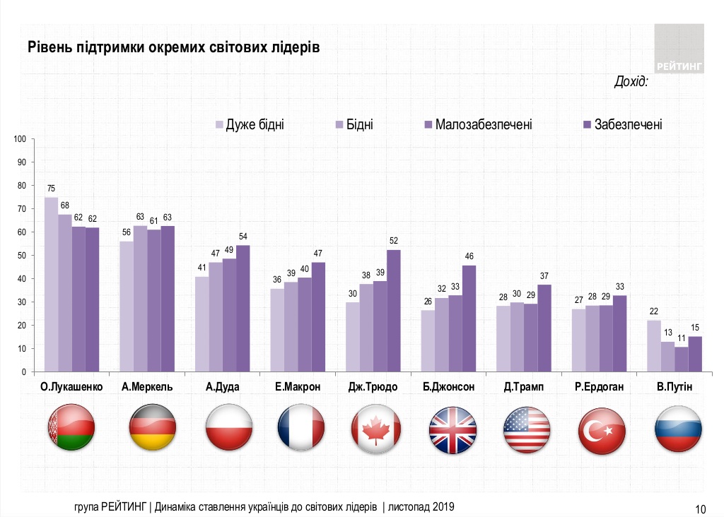 Среди наиболее обеспеченных украинцев симпатии в первой тройке распределились между Ангелой Меркель, Алксандром Лукашенко и Анджеем Дудой. Четвертое место с результатом выше 50% занимает канадский премьер Джастин Трюдо.