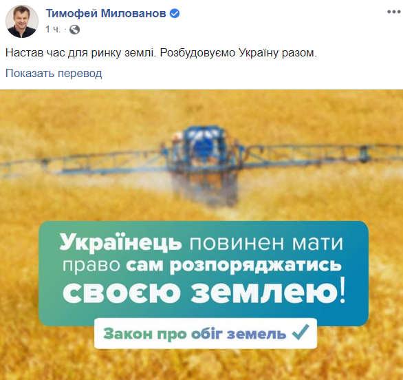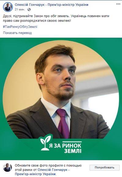 11:34 Премьер Алексей Гончарук запустил в Facebook рамки для аватарок с призывом продавать землю и и хэштег #ТакРинкуОбігуЗемлі.