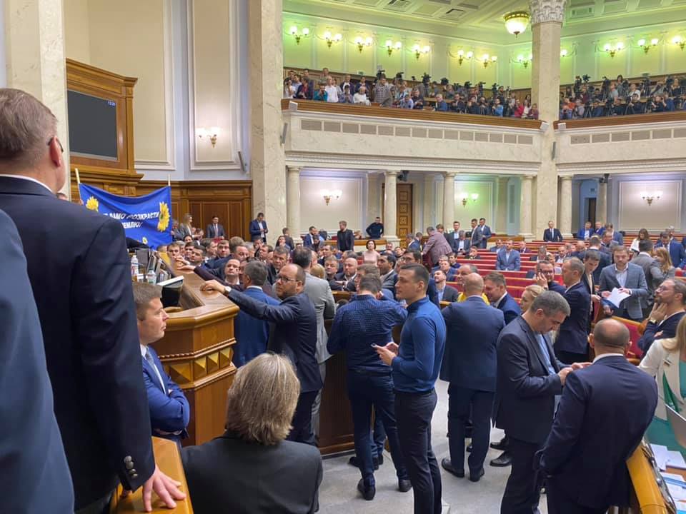 14:40 "Оппозиционная платформа" заблокировала трибуну Рады. Однако Разумков разрешил выступать с места.