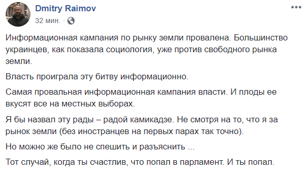 "Продажа земли может привести к банкротству Украины и развалу страны в будущем! Дефолты будут неизбежны", - написал он в Facebook.