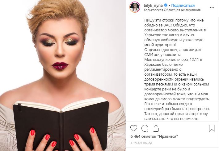 "До последнего надеялась, что этот пост будет таким же светлым, добрым, с дискуссией, как у нас с вами обычно и бывает, но нет. Пишу эти строки, потому что мне обидно за ВАС! Обидно, что организатор моего выступления в Харькове так нагло и алчно обманул любимую и уважаемую мной аудиторию! Отдельно для всех, а так же для СМИ хочу пояснить: мое выступление вчера, 12.11, в Харькове было четко регламентировано с организатором, то есть наши договоренности ограничивались тремя песнями. Ни о каком сольном концерте речи не было и договоренностей тоже, что я и моя команда смело можем подтвердить", - пишет Билык.