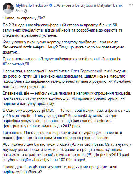 "В Едином госреестре МВД - 10 млн водительских прав, а фото есть только у 2,5 млн водителей. В чем сложности? Когда водитель останавливается для проверки документов, оказывается, что база данных не содержит фотографий в правах, выданных до 2013 года. И решение есть. Оно позволит упростить жизнь украинским водителям, наполнить реестр фото, точно положительно повлияет на уровень безопасности", - говорится в посте.