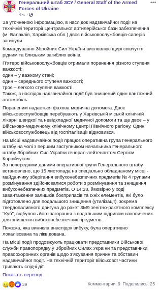 Возможная причина взрывов на военном арсенале в Балаклее 15 ноября - взрыв твердотопливного двигателя ракеты 3М9 зенитно-ракетного комплекса "Куб". Об этом сообщает пресс-служба Генерального штаба Вооруженных сил в Facebook.