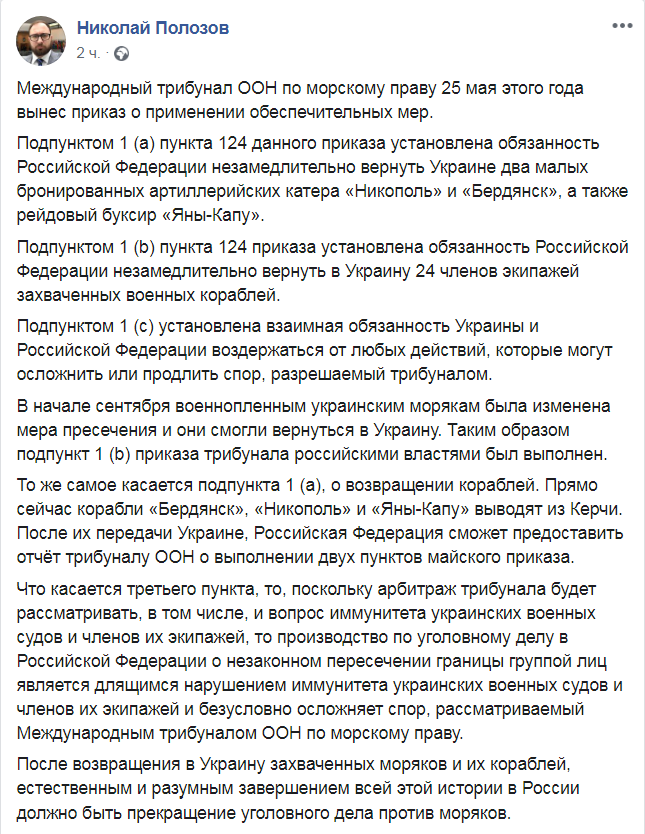 "В начале сентября военнопленным украинским морякам была изменена мера пресечения и они смогли вернуться в Украину. Таким образом подпункт 1(b) приказа трибунала российскими властями был выполнен. То же касается подпункта 1 (a) о возвращении кораблей. Прямо сейчас корабли "Бердянск", "Никополь" и "Яны-Капу" выводят из Керчи. После их передачи Украине РФ сможет предоставить отчет трибуналу ООН о выполнении двух пунктов майского приказа", - написал Полозов.