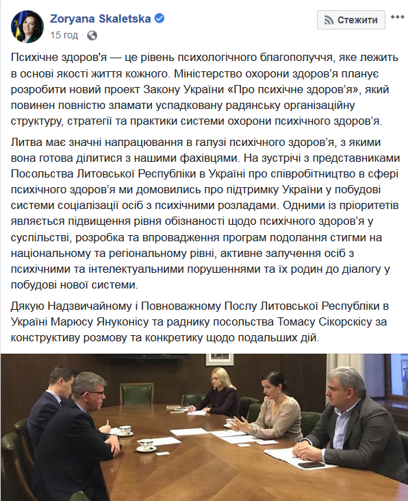Литва имеет значительные наработки в области психического здоровья, с которыми она готова делиться с нашими специалистами. На встрече с представителями Посольства Литовской Республики в Украине посвященной теме сотрудничества в сфере психического здоровья мы договорились о поддержке Украины в построении системы социализации лиц с психическими расстройствами. Одними из приоритетов является повышение уровня осведомленности относительно психического здоровья в обществе, разработка и внедрение программ преодоления стигмы на национальном и региональном уровне, активное привлечение лиц с психическими и интеллектуальными нарушениями и их семей к диалогу в построении новой системы", - написала Зоряна Скалецкая.