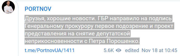"Друзья, хорошие новости. ГБР направило на подпись Генеральному прокурору первое подозрение и проект представления на снятие депутатской неприкосновенности с Петра Порошенко", - написал юрист в Telegram.