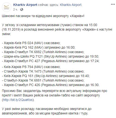 Из-за сильного тумана в понедельник в Международном аэропорту "Харьков" отменен ряд рейсов. Об этом сообщается на странице аэропорта в соцсети Facebook.