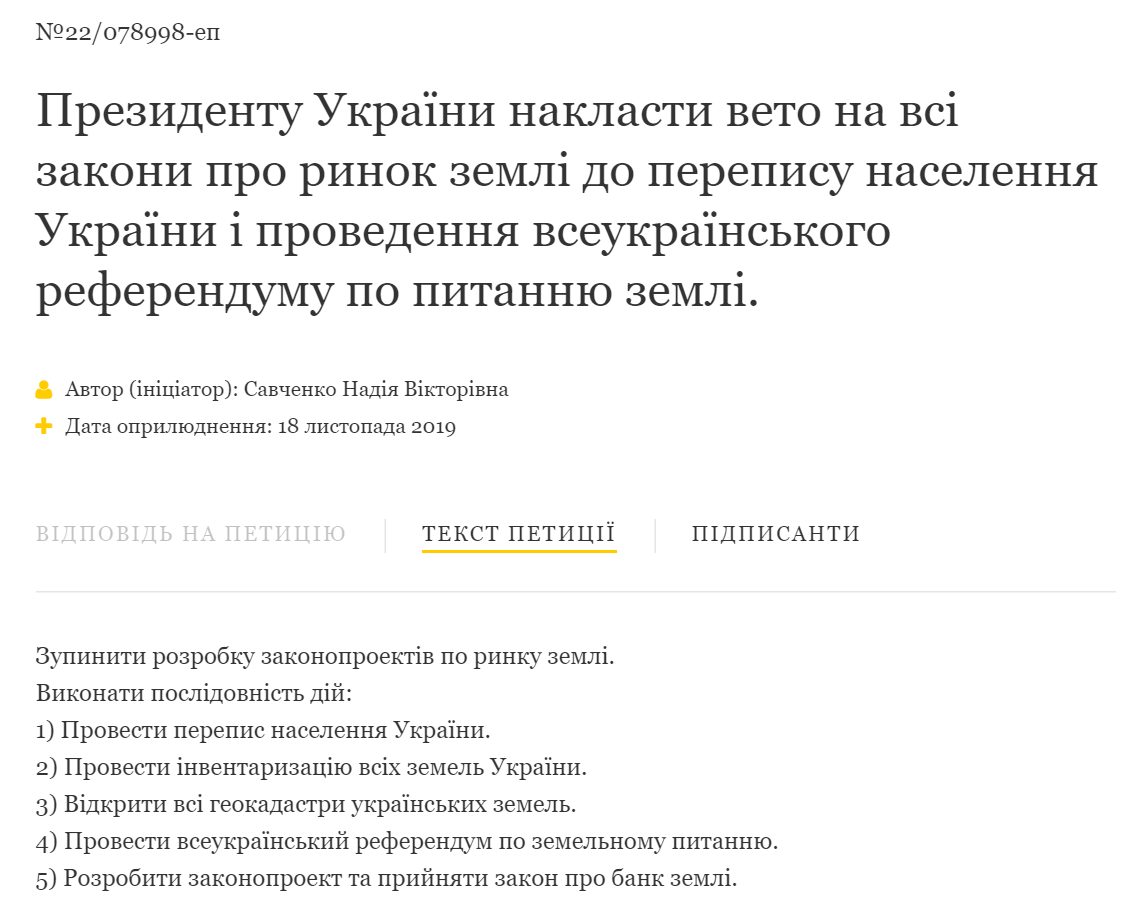 Петиция называется "Президенту Украины наложить вето на все законы о рынке земли до переписи населения Украины и проведения всеукраинского референдума по вопросу земли".