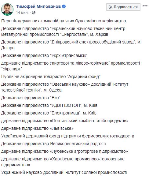 Министр развития экономики, торговли и сельского хозяйства Тимофей Милованов опубликовал перечень госпредприятий, подконтрольных его ведомству, руководители которых были уволены. Список Милованов опубликовал в Facebook.