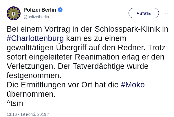 Полиция Берлина в Twitter подтвердила, что нападавший задержан. Подробностей о его личности и мотивах сейчас нет.
