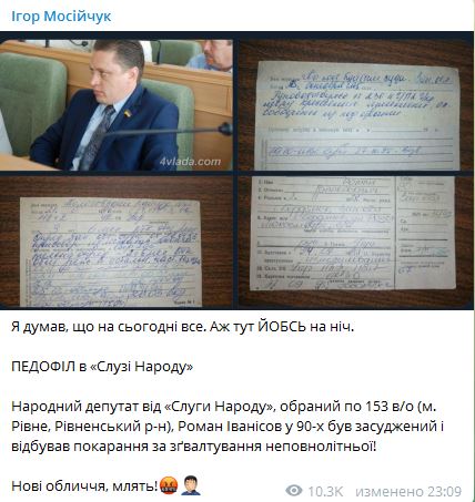 "Народный депутат от ”Слуги народа", избран по 153 и/о (г. Ровно), Роман Иванисов в 90-х был осужден и отбывал наказание за изнасилование несовершеннолетней!" - написал Мосийчук.