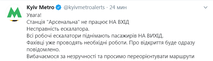Около 10:00 26 ноября Киевский метрополитен объявил, что станция "Арсенальная" из-за неисправности эскалатора работает только на выход. Сообщение об изменении в работе станции появилось в Twitter-аккаунте подземки.