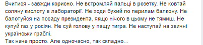 "Владимир Александрович, если вдруг ты это прочитаешь. Не лезь в газовые дела. Потрать время и почитай историю. Например, о том, как Ющенко командировал Дубину на газовые переговоры, а потом влазил в них. А потом влазила Тимошенко и, в надежде, что кинем россиян мы, а не они нас, получила отсрочку на год, после которой Украине влупили цену по 235 долларов за тысячу кубов. Люди менялись, а переговоры вел все тот же Путин. Владимир Александрович, не лезь, не кажись умнее чем ты есть, дай Коболеву разрулить вопрос по-деловому. И – я очень надеюсь, что именно этого он и добивается – дай ему дожать россиян, не ведись на дешевые, во всех смыслах, обещания. Не смешивай политику и бизнес, как в одной трубе смешивают газ туркменский и тюменский".