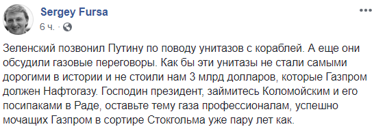"Зеленский позвонил Путину по поводу унитазов с кораблей. А еще они обсудили газовые переговоры. Как бы эти унитазы не стали самыми дорогими в истории и не стоили нам 3 млрд долларов, которые Газпром должен Нафтогазу. Господин президент, займитесь Коломойским и его посипаками в Раде, оставьте тему газа профессионалам, успешно мочащих Газпром в сортире Стокгольма уже пару лет как".