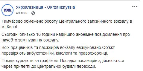 Все пассажиры и сотрудники эвакуированы из здания Центрального железнодорожного вокзала в Киеве (вокзал станции "Киев-Пассажирский") во вторник после поступившего анонимного сообщения о минировании. Об этом сообщается на странице "Укрзализныци" в Facebook.