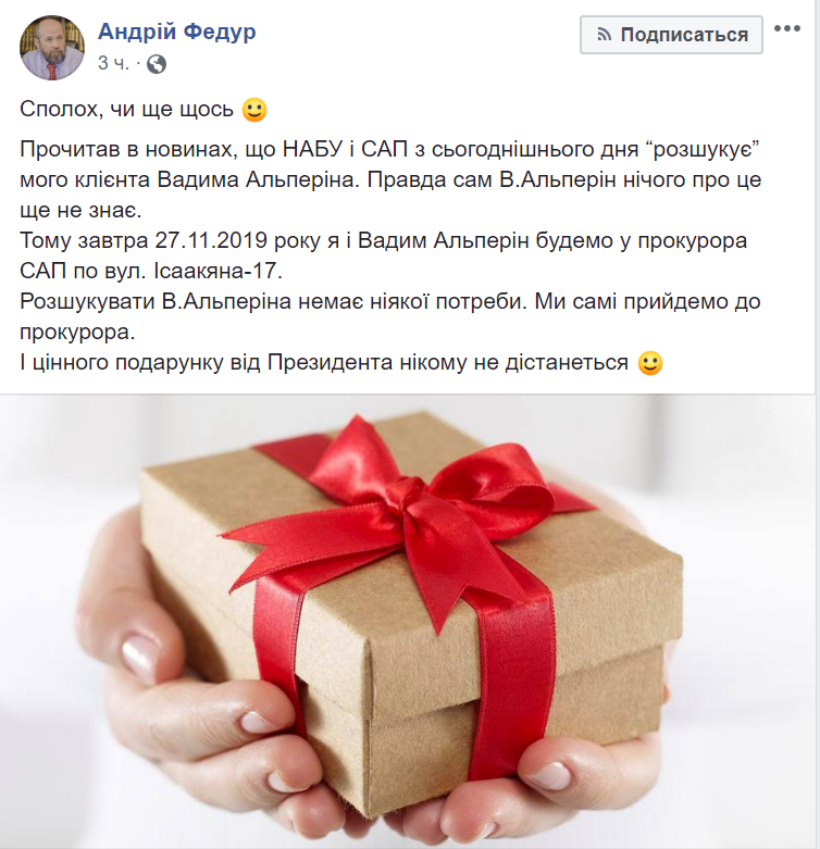 "Переполох или еще что-то. Прочитал в новостях, что НАБУ и САП с сегодняшнего дня (вторника, 26 ноября - Ред.) "разыскивает" моего клиента Вадима Альперина. Правда сам В. Альперин ничего об этом еще не знает. Поэтому завтра 27.11.2019 года я и Вадим Альперин будем у прокурора САП по улице Исаакяна-17. Разыскивать В. Альперина нет никакой надобности. Мы сами придем к прокурору. И ценного подарка от Президента никому не достанется", - заявил адвокат.