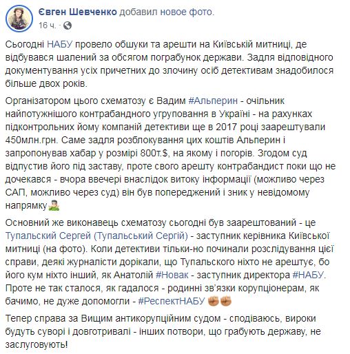 По словам Шевченко, был арестован "основной исполнитель схематоза - Тупальский Сергей - заместитель руководителя Киевской таможни".