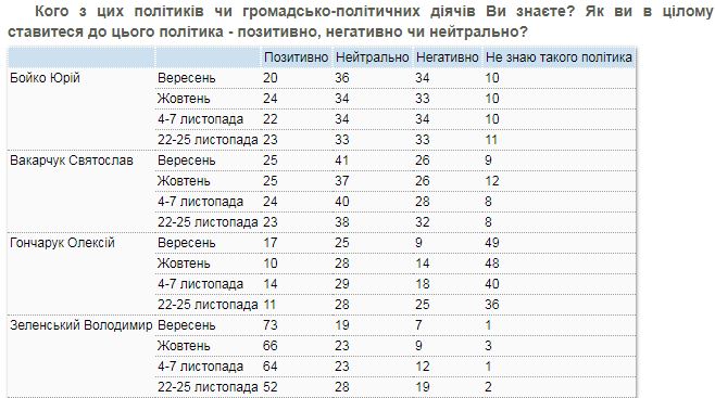 Так, к Гончаруку положительно относятся в конце ноября 11% опрошенных, а отрицательно - 25%.