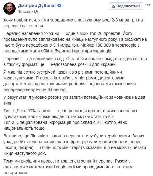 Министр кабинета министров Дмитрий Дубилет решил провести электронную перепись населения, тем самым сэкономив два миллиарда гривен. Об этом он написал на странице в Facebook.