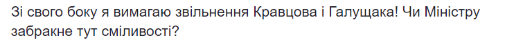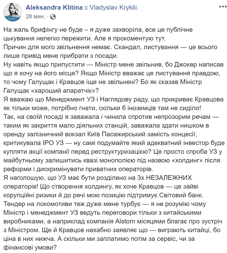 "Ну даже если предположить - министр меня уволил, потому что Джокер написал, что я хочу на его место? Если Министр считает эту переписку правдой, то почему Галущак и Кравцов еще не уволены? Потому как сказал министр (Владислав Криклий - Ред.) Галущак "хароший аппаратчик"? Я считаю, что менеджмент УЗ и наблюдательный совет, прикрывающий Кравцова как только можно, нужно гнать, сколько бы иностранцев там ни сидело!", - написала Клитина.
