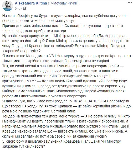 "Со своей стороны я требую увольнения Кравцова и Галущака! Или министру не хватит здесь смелости?", - написала она. По словам Клитиной, на своей должности она мешала непрозрачным решениям министерства, таким как закрытие малодеятельных станций, мешала незаметно сдать в аренду железнодорожный вокзал "Киев-Пассажирский" вместо концессии, критиковала IPO "Укрзализныци".