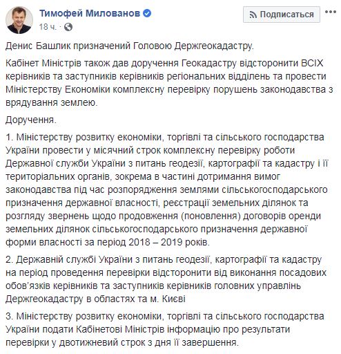 "Министерству развития экономики, торговли и сельского хозяйства Украины провести в месячный срок комплексную проверку работы Государственной службы Украины по вопросам геодезии, картографии и кадастра и ее территориальных органов, в том числе в части соблюдения требований законодательства во время распоряжения землями сельскохозяйственного назначения государственной собственности, регистрации земельных участков и рассмотрения обращений относительно продления (возобновления) договоров аренды земельных участков сельскохозяйственного назначения государственной формы собственности за период 2018 - 2019 годов", - написал чиновник.