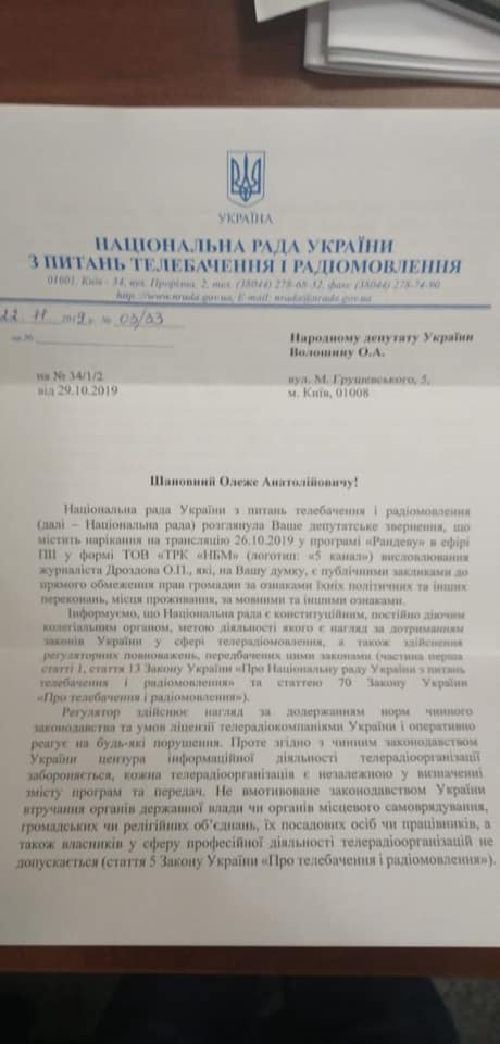 Нацсовет по телевидению и радиовещанию отказал в проверке 5 канала (принадлежит Петру Порошенко) из-за высказываний журналиста Остапа Дроздова в адрес жителей Донбасса по требованию депутата ОПЗЖ Олега Волошина.